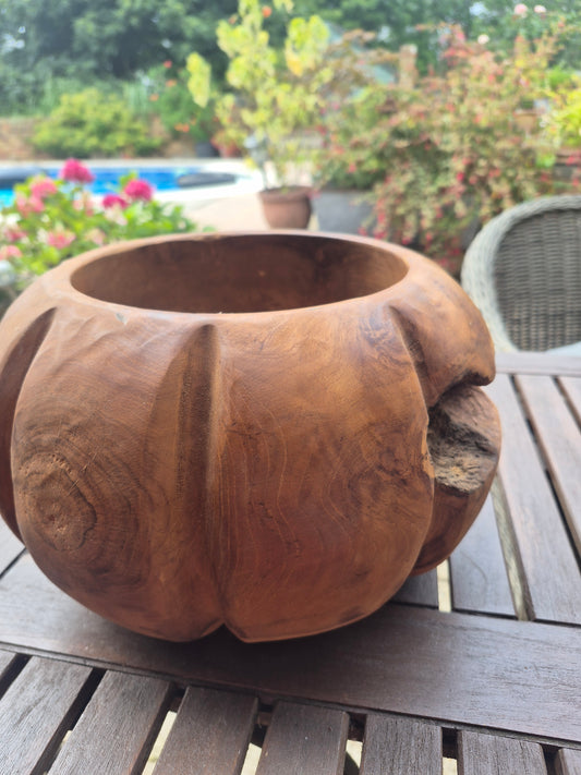 Teak Large deep pumpkin shaped wooden fruit bowl, salad bowl