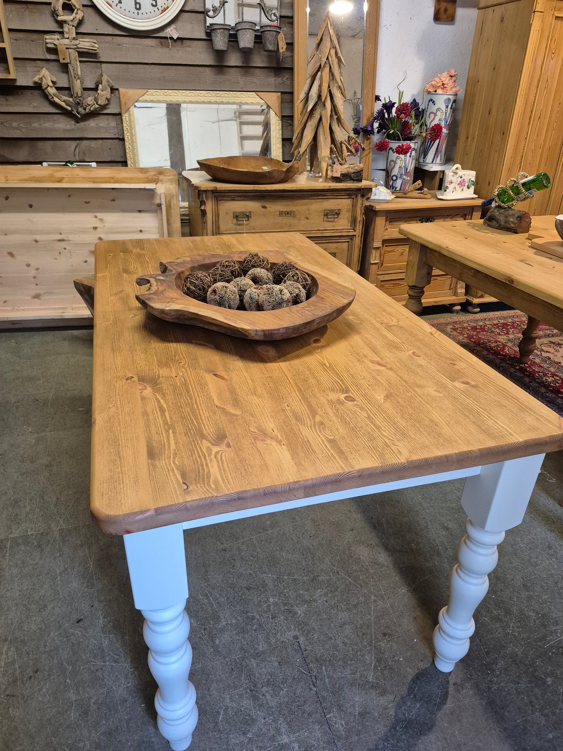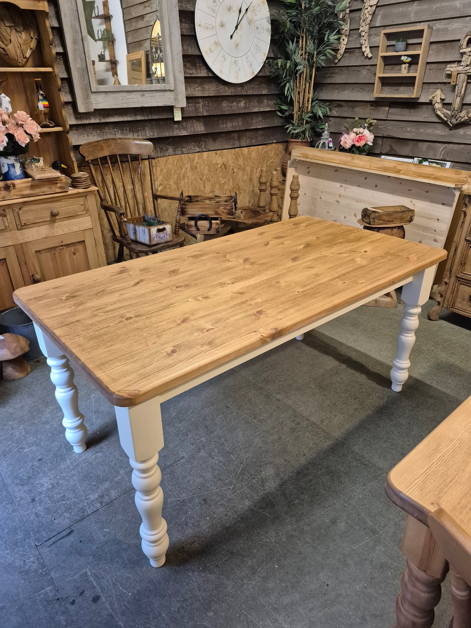 This is a stunning pine farmhouse table with cream painted legs. It is a shop floor table so the price reflects that although it has no signs of wear and tear at all. Viewings welcome.